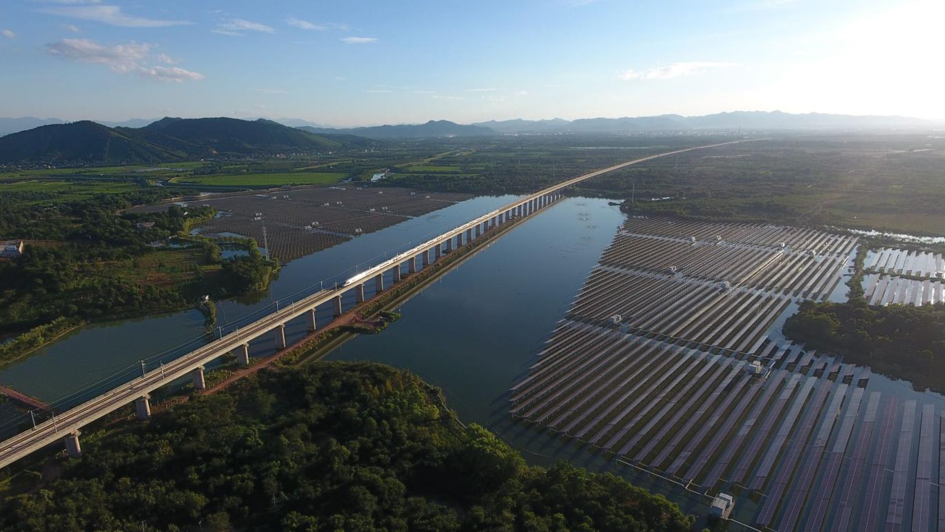 公司50MWP“漁光互補(bǔ)”電站坐落于安吉縣梅溪鎮(zhèn)草蕩水庫(kù),商合杭(商丘-杭州)高鐵線穿湖而過(guò)。電站裝機(jī)容量43.72MWp,可研年利用小時(shí)965小時(shí),年發(fā)電4138萬(wàn)KWh,是集水產(chǎn)養(yǎng)殖、可研示范、生態(tài)休閑、旅游觀光于一體的特色漁業(yè)產(chǎn)業(yè)園,是清潔能源生產(chǎn)示范基地。該項(xiàng)目將漁業(yè)養(yǎng)殖和光伏發(fā)電結(jié)合在一起,通過(guò)在水面上發(fā)電,水面下養(yǎng)殖,工程設(shè)計(jì)上更多的考慮了日常養(yǎng)殖的需求,更好地為漁民提供便利,最大化“漁光互補(bǔ)”的經(jīng)濟(jì)效益,達(dá)到養(yǎng)殖和發(fā)電并行的模式,實(shí)現(xiàn)了一地兩用,極大的提高了土地的利用效率,提高了單位面積土地的產(chǎn)值,做到光伏發(fā)電與漁業(yè)養(yǎng)殖的完美結(jié)合,有效提升了項(xiàng)目綜合效益,新能源發(fā)電、水產(chǎn)養(yǎng)殖和環(huán)境保護(hù)實(shí)現(xiàn)了同步發(fā)展,千畝魚(yú)塘、綠水青山、光伏電站與高鐵線共同構(gòu)成一幅美麗和諧的生態(tài)畫(huà)卷。